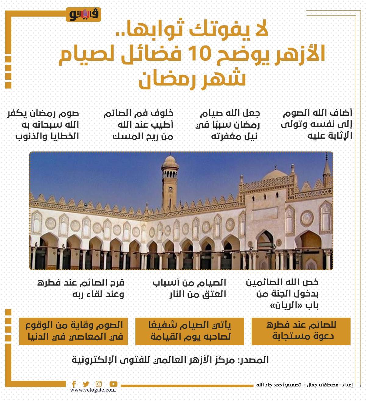 "لا يفوتك ثوابها".. الأزهر يوضح 10 فضائل لصيام شهر رمضان (إنفوجراف)