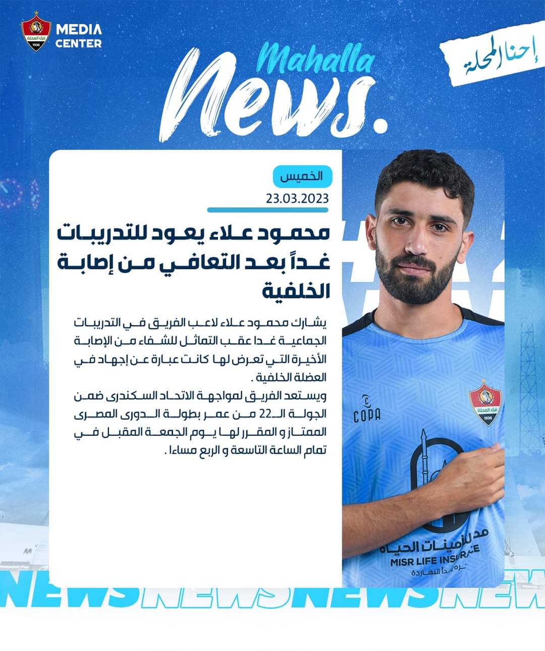 يشارك محمود علاء لاعب فريق غزل المحلة في التدريبات الجماعية اليوم الجمعة عقب التماثل للشفاء من الإصابة الأخيرة التي تعرض لها كانت عبارة عن إجهاد في العضلة الخلفية.