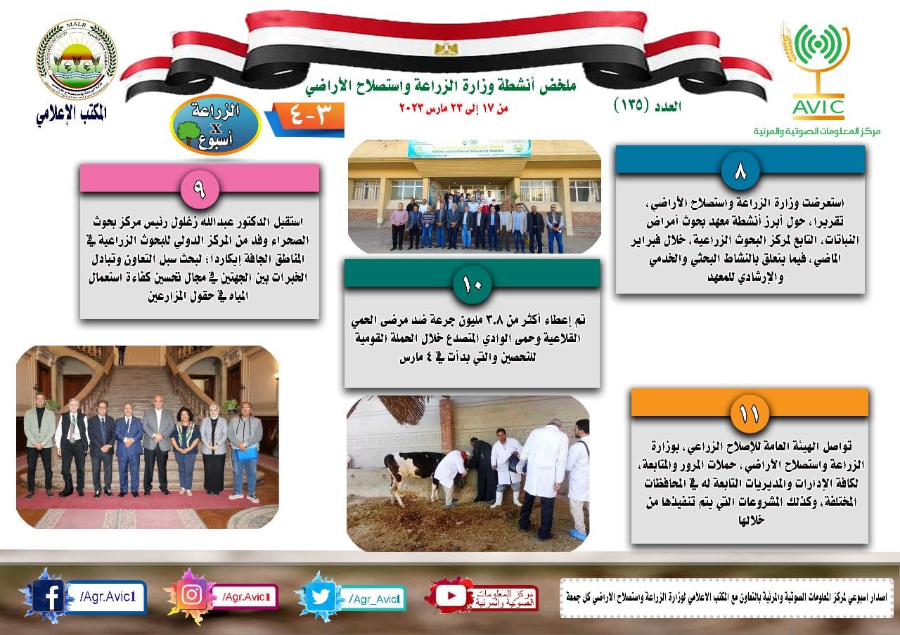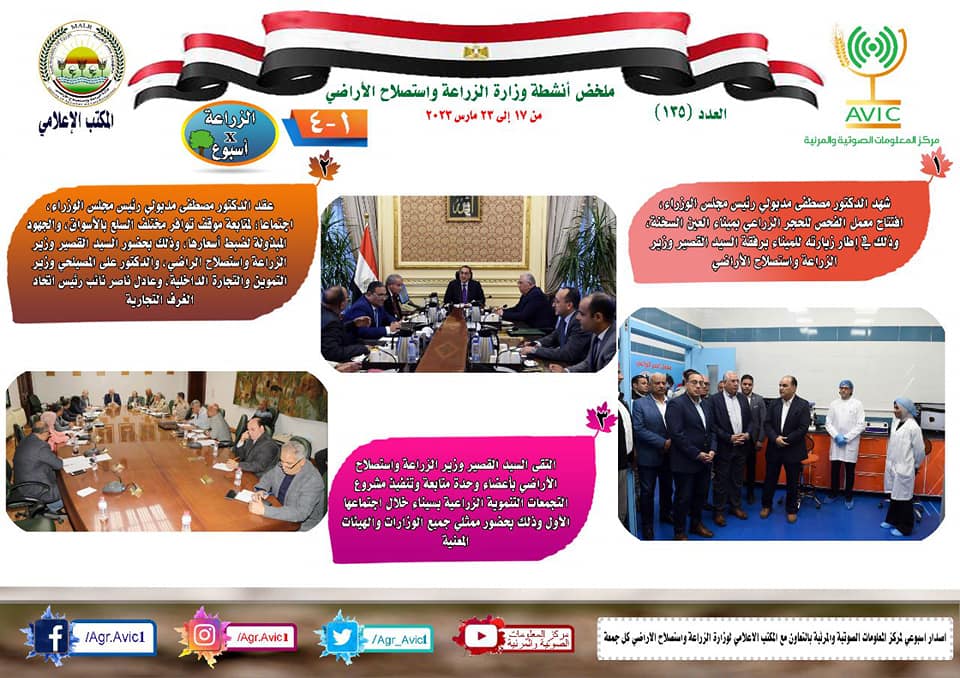 أصدر مركز المعلومات الصوتية والمرئية، التابع لوزارة الزراعة واستصلاح الأراضي، "الانفوجراف الأسبوعي" في نسخته رقم135، حول الحصاد الاسبوعي لأهم أنشطة الوزارة، خلال الأسبوع الماضي في الفترة من 17 إلى 23 مارس الجاري، وذلك بالتعاون مع المكتب الاعلامي للوزارة.