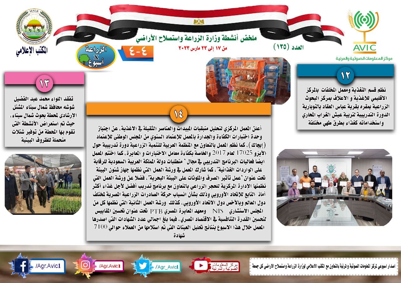 بينما واصلت الهيئة العامة للإصلاح الزراعي، بوزارة الزراعة واستصلاح الأراضي، حملات المرور والمتابعة، لكافة الإدارات والمديريات التابعة لها في المحافظات المختلفة، وكذلك المشروعات التي يتم تنفيذها من خلالها، كما نظم قسم التغذية ومعمل المخلفات بالمركز الإقليمي للأغذية والأعلاف بمركز البحوث الزراعية بمقره بقرية عباس العقاد بالنوبارية الدورة التدريبية لتربية عيش الغراب المحاري واستخداماته كغذاء بطرق طهي مختلفة.