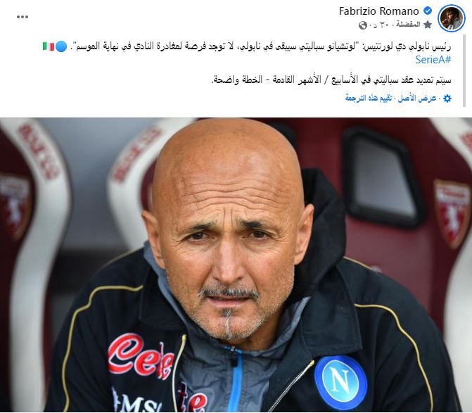 أعلن دي لورنتيس رئيس نادي نابولي عن بقاء لوتشيانو سباليتي مدير فني الفريق في الموسم المقبل ولا يوجد نية بينه وبين إدارة النادي لرحيل المدرب في نهاية الموسم، وأكد أنه سيتم تمديد عقد سباليتي في الأسابيع المقبلة.