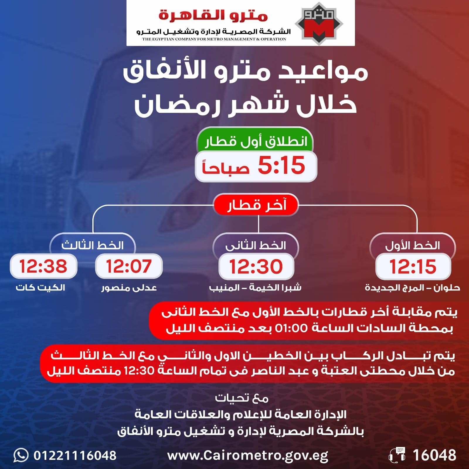 وقررت إدارة المترو بدء العمل بـ المواعيد الجديدة لمترو الأنفاق بداية من 23 مارس على أن يبدأ تشغيل مترو الأنفاق كالتالي: