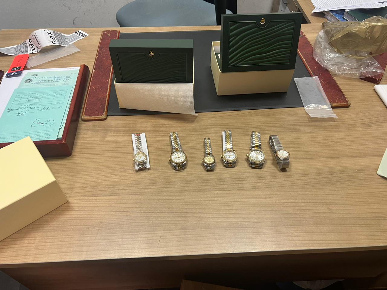 وبتفتيش حقائبه على جهاز الفحص بالأشعة بواسطة أنور محمد وعمرو غزال مأموري الجمرك اللذين تلاحظ لهما وجود كثافات معدنية صغيرة الحجم داخل حقائب الراكب، قام هاني أحمد أبو طالب مدير الحركة المشرف على صالة الوصول بمبنى الركاب رقم ٣ بتكليف هيثم محمد مأمور الجمرك بتفتيش حقائب الراكب يدويًّا مما أسفر عن وجود خمس ساعات ماركة رولكس وساعة ماركة أوميجا، تم تشكيل لجنة مكونه من هيثم محمد ومصطفى بحر مأموري الجمرك لتوصيف وتحريز المضبوطات.
