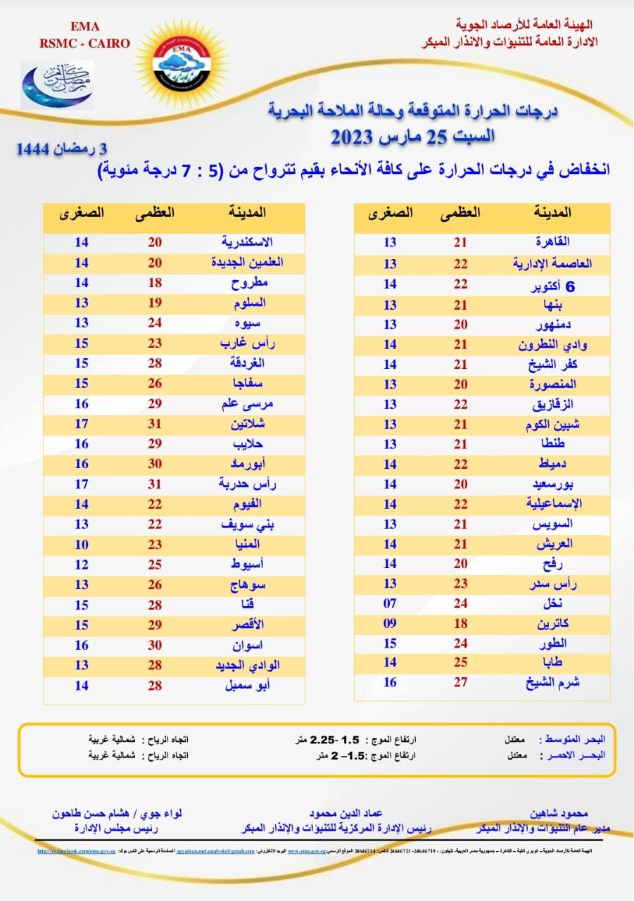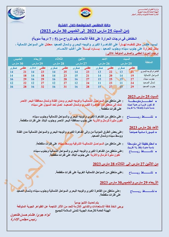 حالة الطقس في مصر، كشف هيئة الأرصاد الجوية، حالة الطقس ودرجات الحرارة والظواهر الجوية المتوقعة اليوم السبت الموافق 25 مارس حتى الخميس 30 مارس 2023.