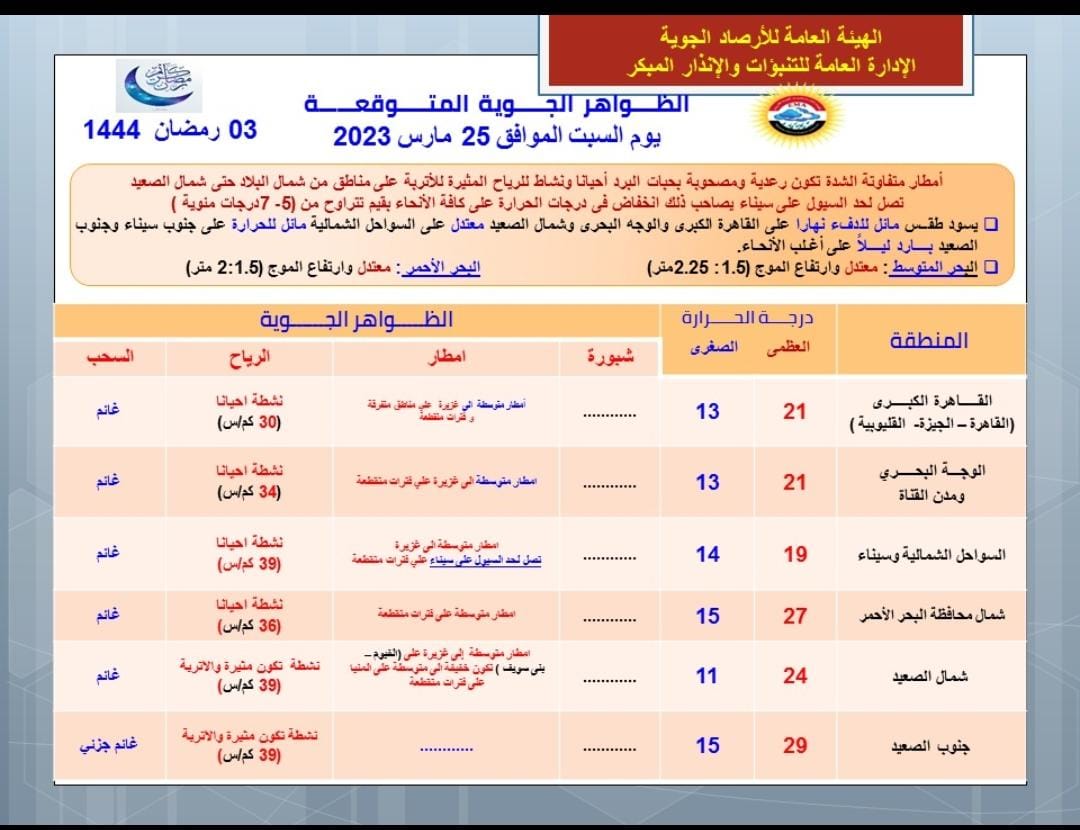 وقالت الأرصاد إن حالة الطقس تشهد اليوم السبت 25 مارس 2023 انخفاض في درجات الحرارة على كافة الأنحاء، مع استمرار سقوط الأمطار على شمال البلاد مرورًا بالقاهرة الكبرى حتى شمال الصعيد وسيناء وشمال محافظة البحر الأحمر، تصل إلى حد السيول على سيناء.