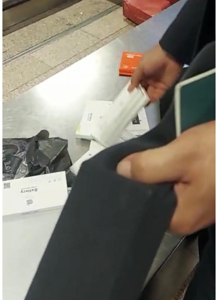 وبتفتيش حقائب الراكب علي جهاز الفحص بالأشعة بواسطة كل من أحمد سيد أحمد مأمور الجمرك، ومحمود شحاته رئيس القسم، واللذان تلاحظ لهما وجود كثافات متكررة بكثرة داخل حقائب الراكب، وقام إبراهيم عامر مدير الحركة المشرف على صالة الوصول بمبني الركاب رقم ٣، بتكليف محمود محمد فتحي مأمور الجمرك، بتفتيش حقائب الراكب يدويا مما اسفر عن وجود كمية من مستلزمات الهواتف المحمولة بين طيات الملابس بالحقائب والبطاريات داخل الجوارب.