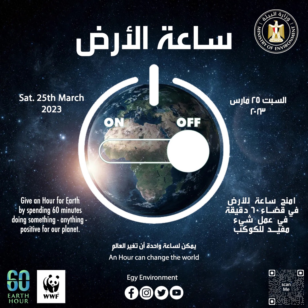 تشارك مصر دول العالم في المبادرة العالمية لإطفاء الأنوار "ساعة الأرض" والتى تأتي هذا العام تحت شعار "حان الوقت للطبيعة"، حيث يقوم عدد من المواطنين والجهات والمعالم السياحية بإطفاء الأنوار والأجهزة الكهربائية غير الضرورية وإضاءة الشموع لمدة ساعة من الساعة 8.30 إلى 9.30 مساءًا يوم ٢٥ مارس ٢٠٢٣.