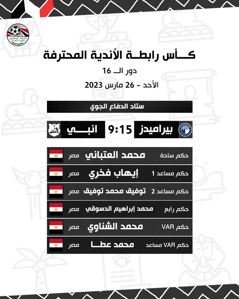 كأس الرابطة المصرية، أعلنت لجنة الحكام الرئيسية باتحاد الكرة، طاقم حكام مباراة بيراميدز وإنبي المقرر لها اليوم الأحد في دور الـ16 ببطولة كأس الرابطة.