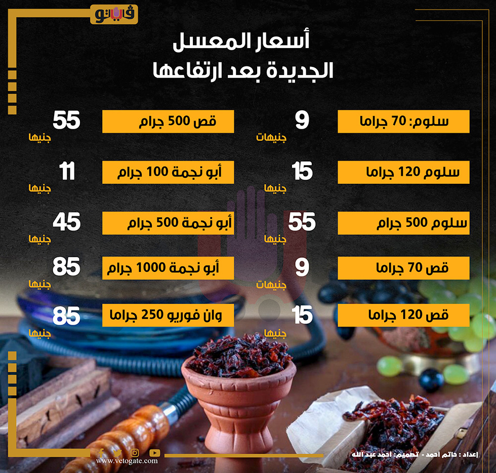أسعار المعسل الجديدة بعد ارتفاعها (إنفوجراف) الأحد 26/مارس/2023 - 01:16 م 3/26/2023 1:16:28 PM معسل قص، فيتو شارك طباعة 18 حجم الخط شارك طباعة المعسل أسعار المعسل الجديدة ارتفاع أسعار المعسل معسل سلوم معسل قص