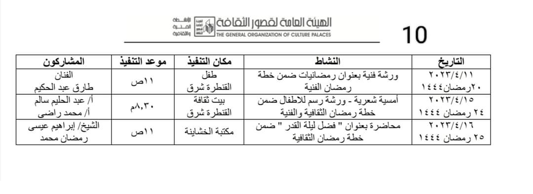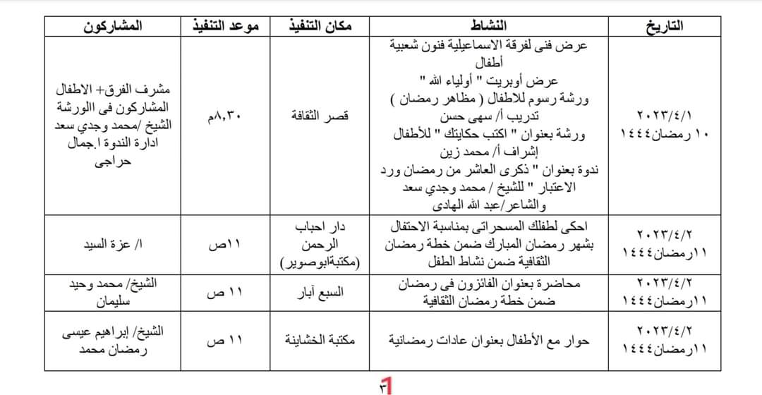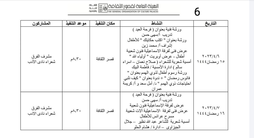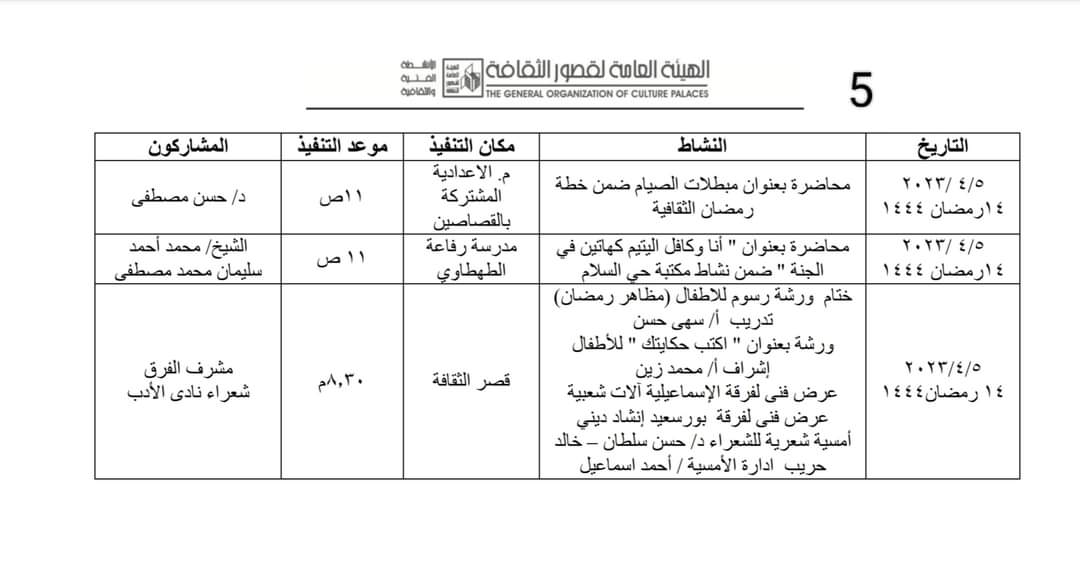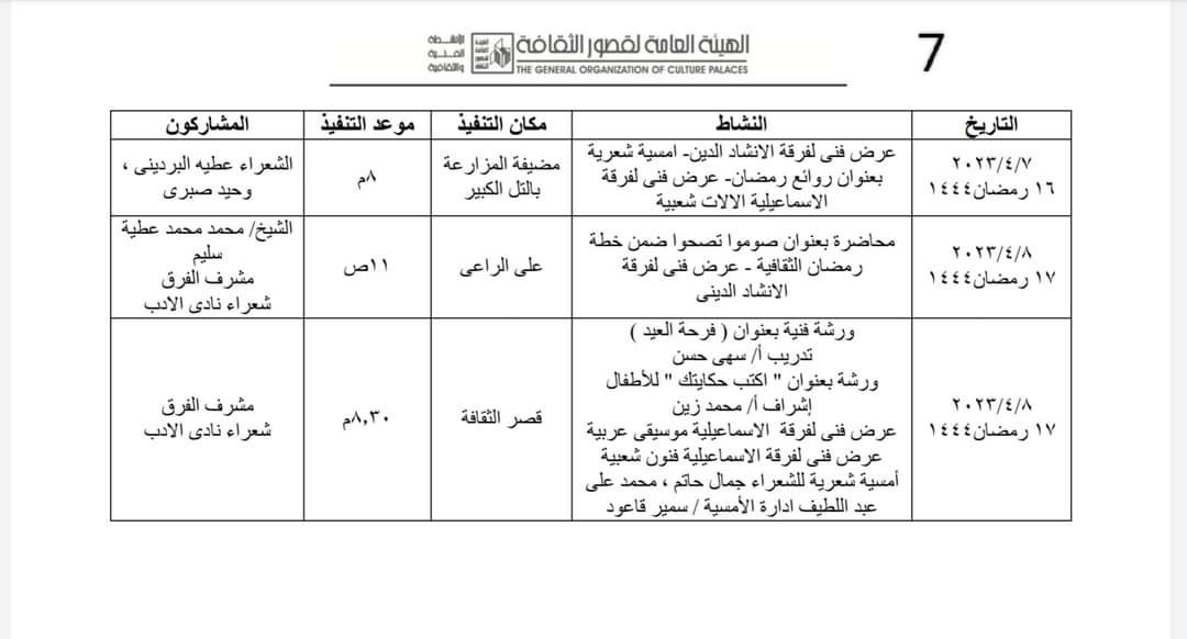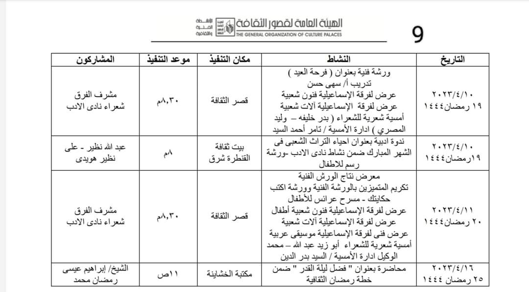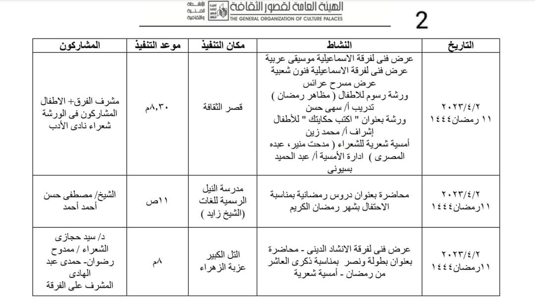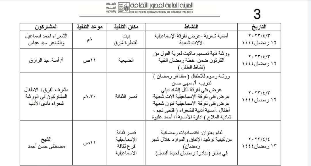 ننشر برنامج ليالى رمضان الثقافية في الإسماعيلية