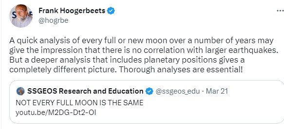 وتابع الباحث الهولندي فرانك هوجربتس حديثه عن علاقة القمر بوقوع الزلازل المدمرة فقال: "قد يعطي التحليل السريع لكل قمر مكتمل أنطباعًا جديدًا على مدى عدد من السنوات، بأنه لا توجد علاقة بين القمر مع الزلازل المدمرة. لكن التحليل الأعمق الذي يتضمن مواقع الكواكب يعطي صورة مختلفة تمامًا. التحليلات الشاملة ضرورية!"