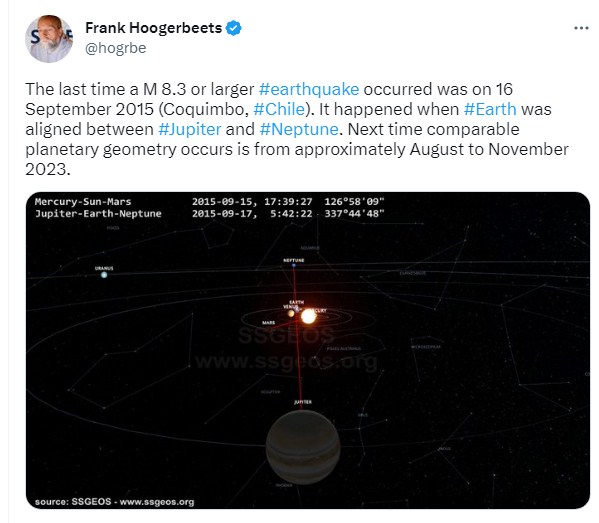 وقال فرانك هوجربتس عن توقعه المرعب: "كانت آخر مرة حدث فيها زلزال مدمر بقوة 8.3 درجة بمقياس ريختر أو أكبر زلزال وقع في 16 سبتمبر 2015 في كوكويمبو تشيلي، وحدث ذلك عندما وقعت الأرض بمحاذاة المشترى ونيبتون، وفي المرة القادمة التي تحدث فيها هندسة كوكبية مماثلة ستكون من أغسطس إلى نوفمبر 2023 تقريبًا."