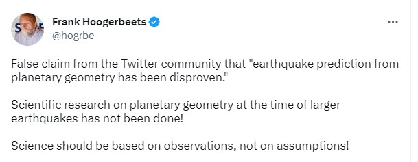 وبدأ الباحث الهولندي فرانك هوجربتس حديثه عن زلزال مدمر يضرب العالم، بتوضيح حقيقة التنبؤ بالزلازل من خلال هندسة الكواكب، فقال "هناك ادعاء كاذب من مجتمع تويتر يقول إن "التنبؤ بالزلازل من هندسة الكواكب قد تم دحضه"، لم يتم إجراء بحث علمي حول هندسة الكواكب في وقت حدوث الزلازل المدمرة. يجب أن يعتمد العلم على الملاحظات وليس على الافتراضات".