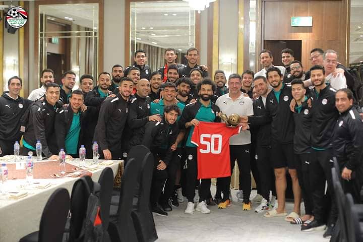 وحرص منتخب مصر على تجهيز مفاجأة لمحمد صلاح نجم ليفربول ومنتخب مصر بتجهيز قميص يحمل ٥٠ هدفا له مع منتخب مصر و١٢٩ هدفا الذي أحرزهم مع ليفربول وأصبح الهداف التاريخي للنادي.، ووجه محمد صلاح الشكر لجهاز المنتخب واللاعبين على هذه اللفتة الطيبة.