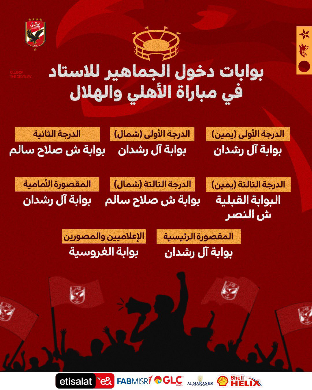 ونشر الحساب الرسمي للنادي الأهلي عبر فيس بوك صورة توضيحية لبوابات دخول الجماهير مباراة الهلال السوداني بدوري أبطال أفريقيا