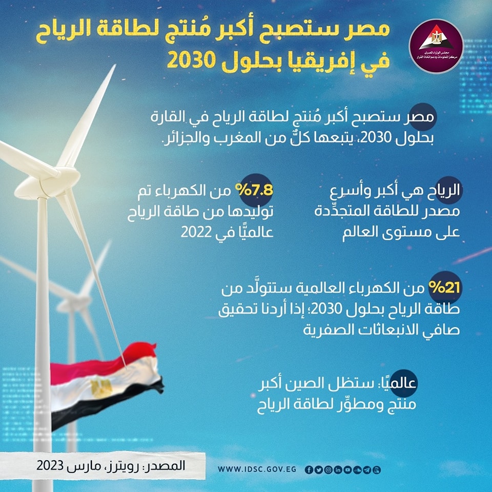 نشرت الصفحة الرسمية لـ مركز المعلومات ودعم اتخاذ القرار بمجلس الوزراء، إنفوجرافا جديدا تحت عنوان (مصر ستصبح أكبر منتج لطاقة الرياح في إفريقيا بحلول 2030).