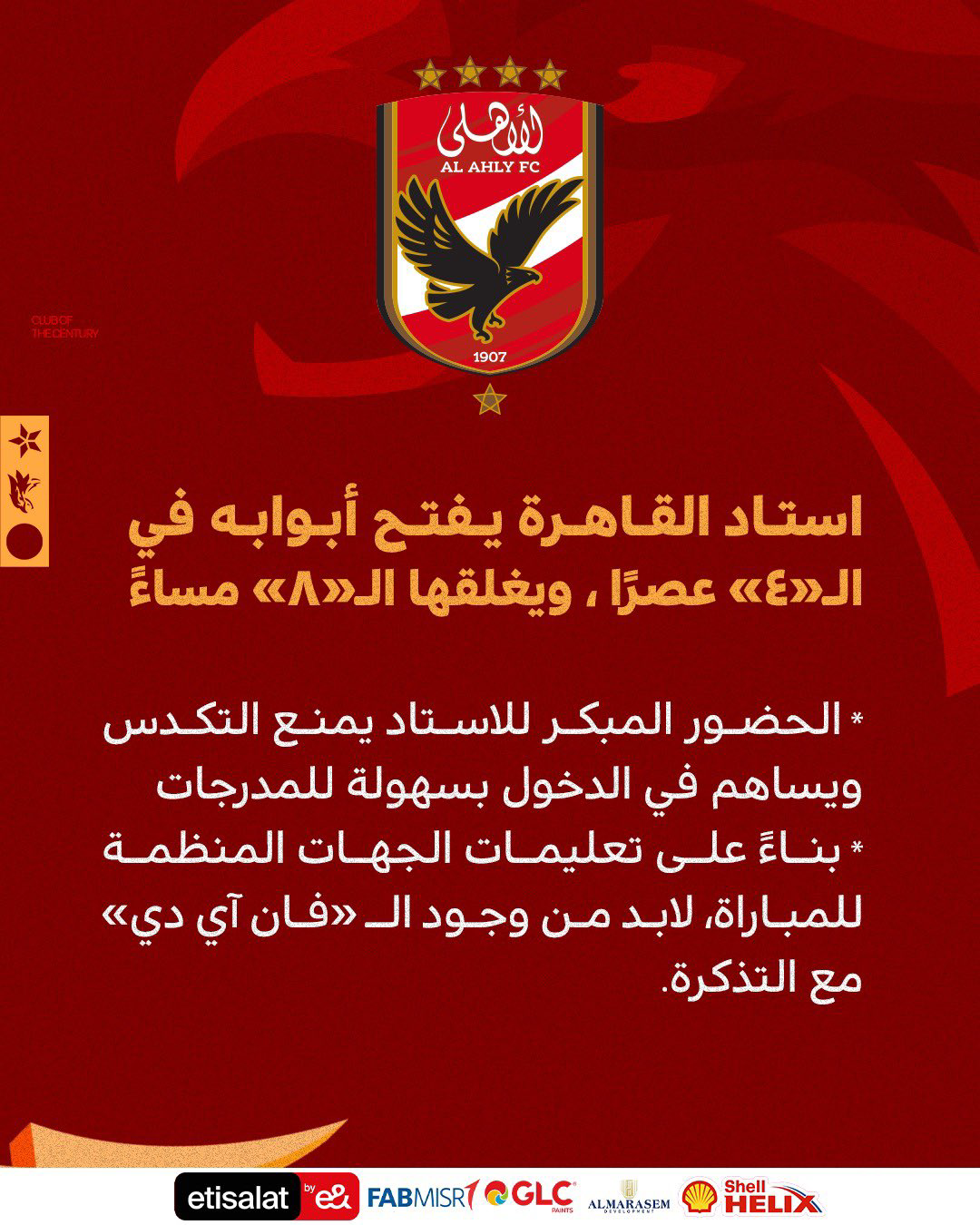 ونشر الحساب الرسمي للنادي الأهلي عبر “فيس بوك” صورة بمواعيد فتح ابواب استاد القاهرة لاستقبال مباراة الأهلى والهلال السوداني، وعلق عليها قائلا: "استاد القاهرة يفتح أبوابه في الـ "4 " عصرًا ويغلقها الـ "8" مساءً.