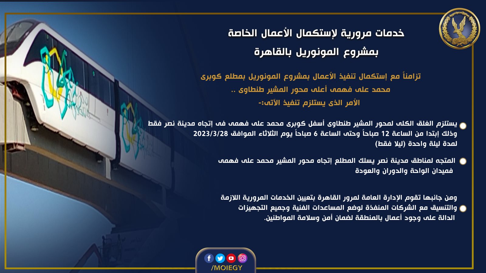 تقوم الإدارة العامة لمرور القاهرة بتعيين الخدمات المرورية اللازمة لمواجهة أية كثافات مرورية متوقعة وتسيير حركة المرور وذلك تزامنًا مع استكمال تنفيذ الأعمال بمشروع المونوريل بمطلع كوبرى محمد على فهمى أعلى محور المشير طنطاوى.