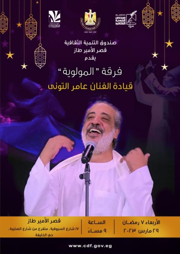 ويستضيف قصر الأمير طاز بحي الخليفة عرض فرقة المولوية للفنان عامر التوني، وتقدم الفرقة بمناسبة شهر رمضان الكريم مجموعة من القصائد لكبار شعراء الصوفية مثل ابن الفارض وابن عربي والسهروردي والحلاج وأبو ميدن الغوث.