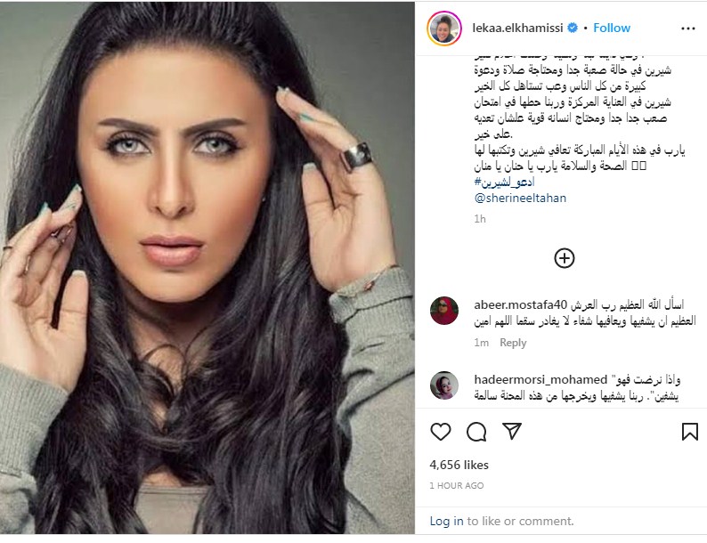 وقالت لقاء الخميسي من خلال موقع “إنستجرام”:" شيرين الطحان حالتها مازالت صعبة للغاية ومتواجدة بغرفة العناية المركزة مطالبة الجمهور بالدعاء لها.