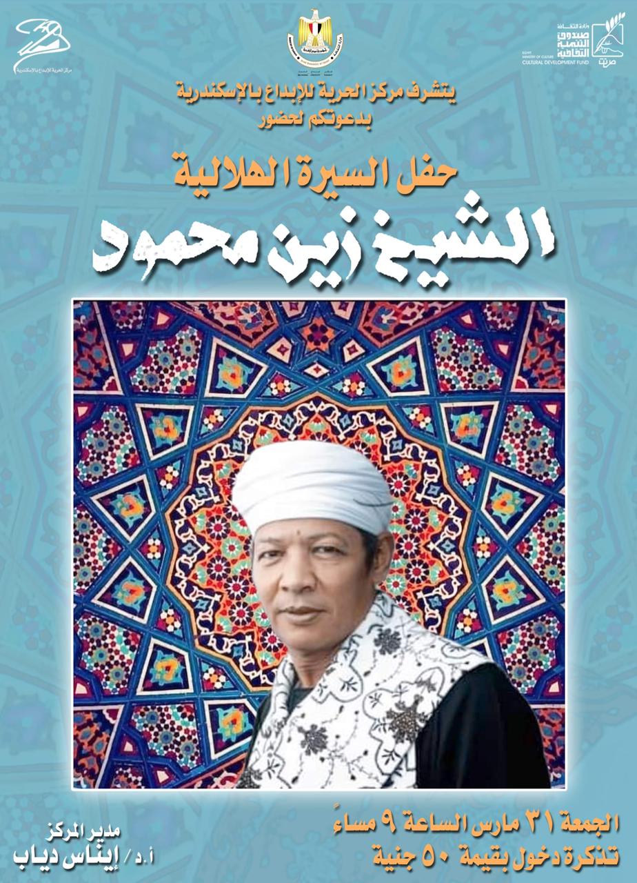 يستضيف مركز الحرية للإبداع بالإسكندرية، التابع لصندوق التنمية الثقافية، حفل السيرة الهلالية للشيخ زين محمود، وذلك يوم الجمعة المقبل 31 مارس، بقاعة المسرح.