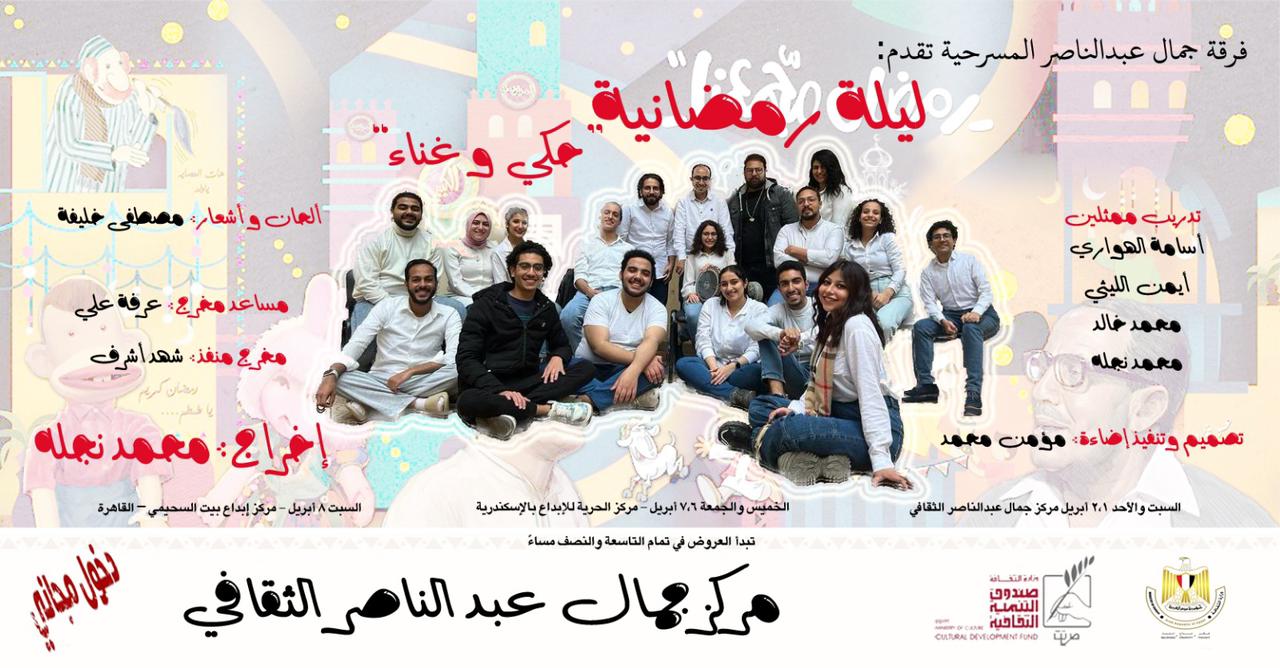 كما ينظم مركز الحريه للإبداع بالتعاون مع مركز جمال عبد الناصر الثقافي التابعات لقطاع صندوق التنمية الثقافية ليله رمضانية حكي وغناء لفرقه جمال عبد الناصر المسرحيه وذلك يومي الخميس والجمعه ٦ و٧ ابريل الساعه ٩،٣٠ مساءا علي مسرح مركز الحرية للإبداع بالإسكندرية.