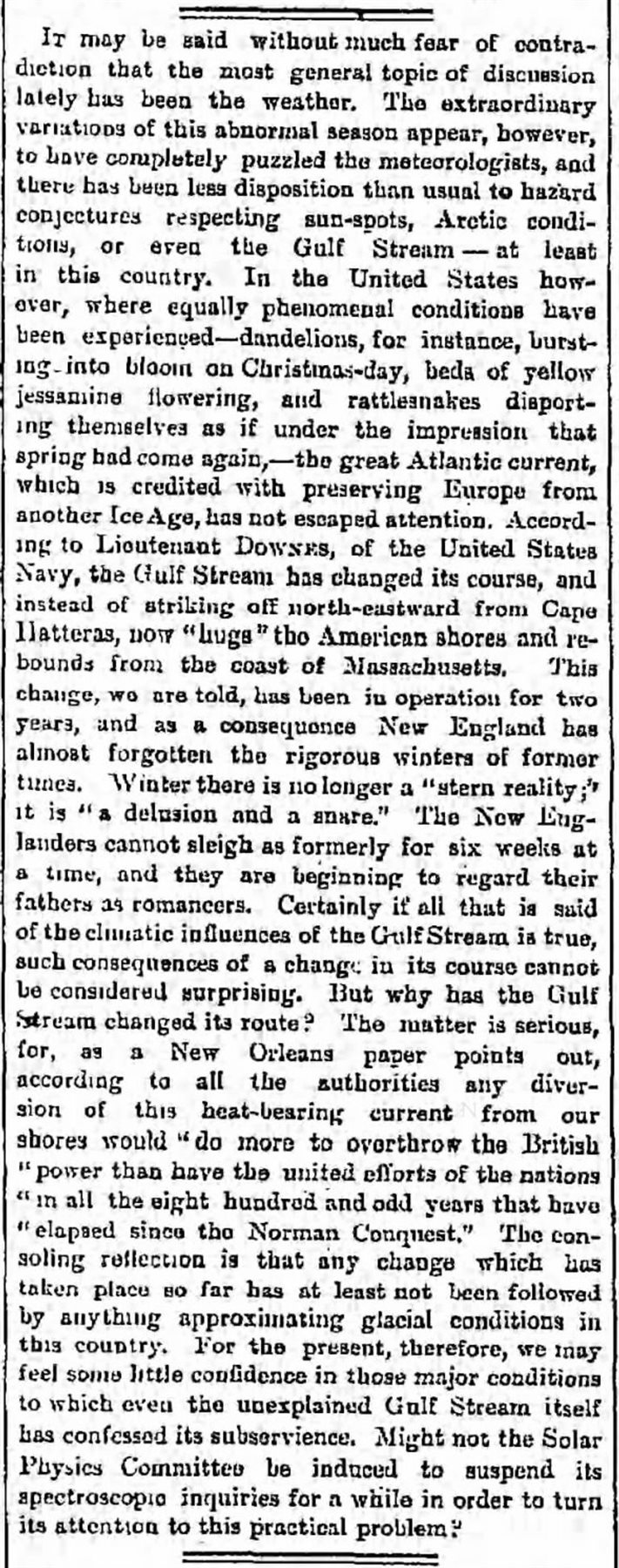 ومن المقالات المبكرة التي رصدت بها الصحيفة آثار التغير المناخي، مقال نشر عن تغير تيار الخليج الدافئ لمساره في عام 1890، في سابقة كانت الأولى في ذلك الوقت.