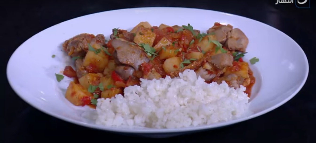 ثم نضيف البطاطس للمكونات السابقة، مع التقليب المستمر، ونضيف الطماطم، ثم نضيف الكبد، مع التقليب المستمر.