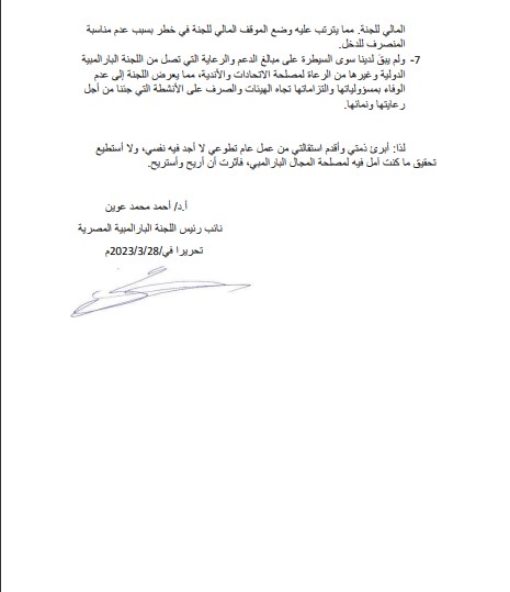 وأكد عوين في استقالته، أن اللجنة البارالمبية تعاني أزمات مالية كبيرة، وأنه بالرغم من ذلك تم زيادة الرواتب بشكل مبالغ فيه، وتم تعيين موظفين جدد بمرتبات كبيرة، وهو ما يضع اللجنة في أزمة مالية كبيرة.