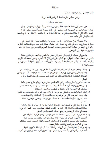 كشف أحمد عوين في استقالته أن الدكتور حسام الدين مصطفى رئيس اللجنة البارالمبية يقيم بشكل شبه دائم خارج مصر، ويقوم بإدارة العمل داخل اللجنة عن بعد وهو ما يؤثر على سير العمل بشكل طبيعي.