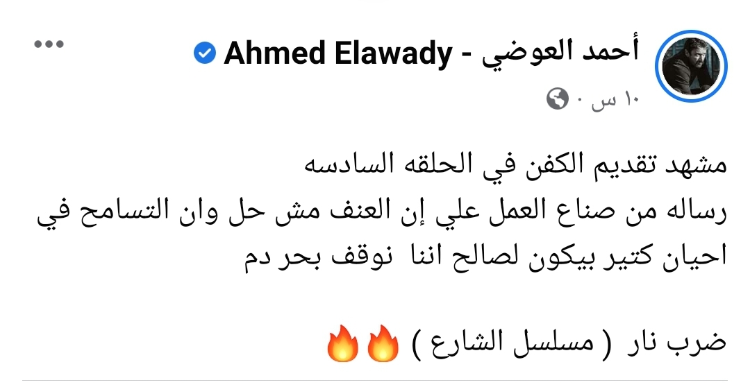أوضح الفنان أحمد العوضي أن الحلقة السادسة من مسلسل ضرب نار كانت تقدم فكرة التسامح والبعد عن الثأر ومشهد تقديم الكفن هو رسالة من صناع العمل إن العنف ليس حلا لأخذ الحقوق.