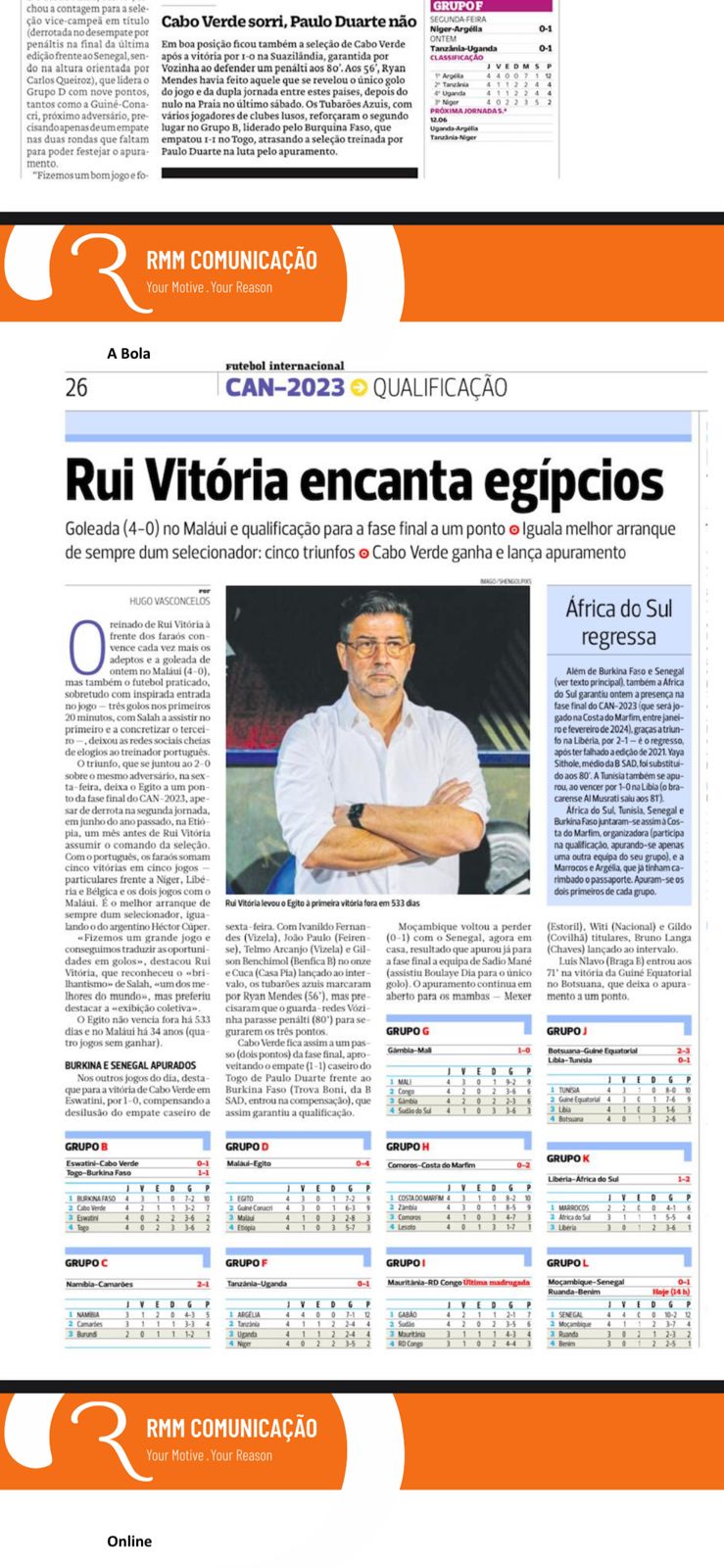 وقالت صحيفة ريكورد البرتغالية أن روي فيتوريا يخطو خطوات عملاقة مع منتخب مصر بنسبة فوز 100٪ منذ توليه المهمة.