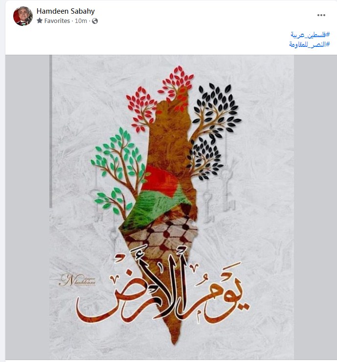 وعن ذكرى يوم الأرض كتب حمدين صباحي تدوينة على الفيس بوك فقال: "#فلسطين_عربية #النصر_للمقاومة"، وأعقبها بصورة لعلم فلسطين على خريطة فلسطين المحتلة، وكُتب عليها: "يوم الأرض".