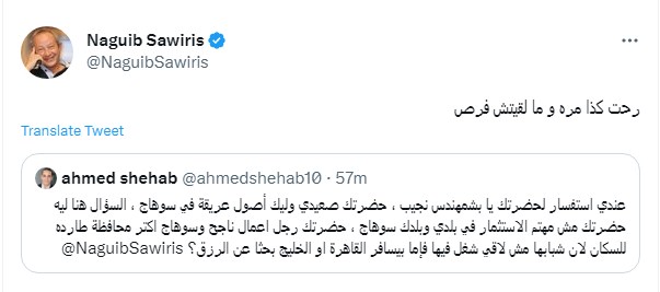 جاء ذلك ردًا على سؤال أحد المتابعين للمهندس نجيب ساويرس عن فرص الاستثمار في الصعيد فقال: (عندي استفسار لحضرتك يا بشمهندس نجيب، حضرتك صعيدي وليك أصول عريقة في سوهاج، السؤال هنا ليه حضرتك مش مهتم الاستثمار في بلدي وبلدك سوهاج، حضرتك رجل أعمال ناجح وسوهاج أكتر محافظة طاردة للسكان لأن شبابها مش لاقي شغل فيها فإما بيسافر القاهرة أو الخليج بحثا عن الرزق؟).