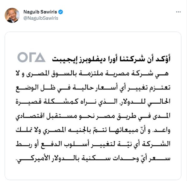 وأضاف المهندس نجيب ساويرس في بيان له، عبر حسابه بتويتر: “مبيعاتها تتم بالجنيه المصري ولا تملك الشركة أي نية لتغيير أسلوب الدفع أو ربط سعر أي وحدات سكنية بالدولار الأمريكي”.