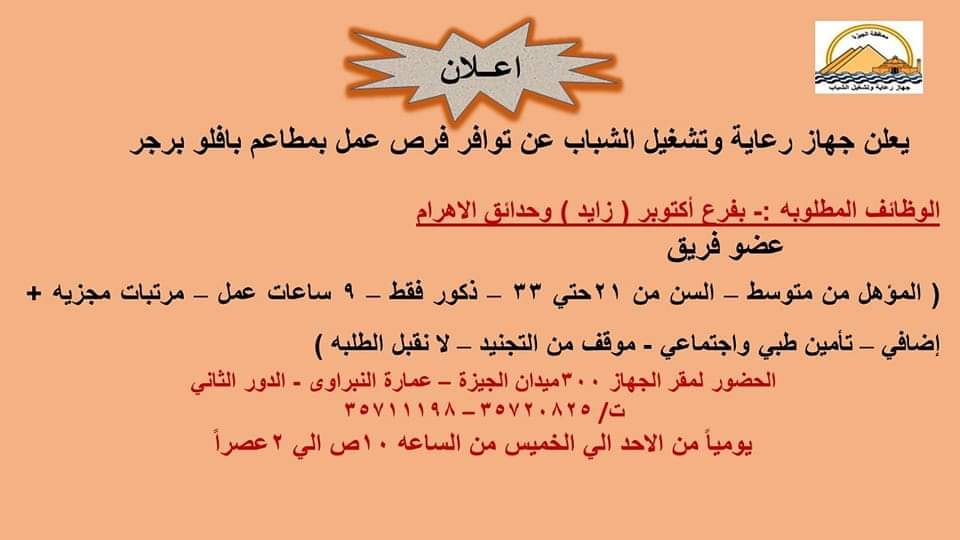 يعلن جهاز تشغيل الشباب بمحافظة الجيزة عن توافر فرص عمل بمطاعم بافلو برجر الشهيرة ، وأوضح الجهاز أن الوظائف المطلوبة هي عضو فريق بفرعي المطعم أكتوبر (زايد) وحدائق الاهرام.