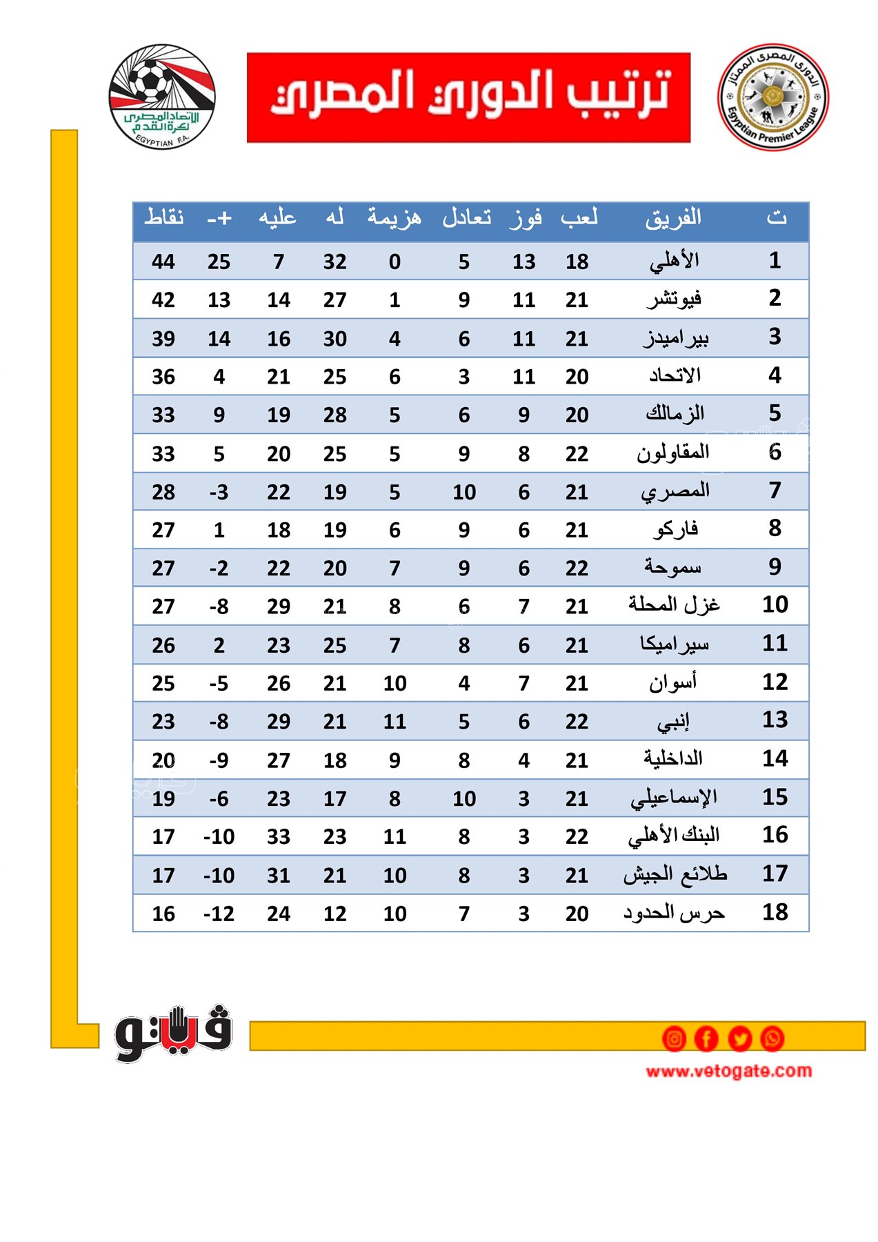 ترتيب الدوري المصري الممتاز، تنشر فيتو جدول ترتيب الدوري المصري الممتاز بعد مباريات اليوم في افتتاح الجولة الـ 22 للمسابقة.