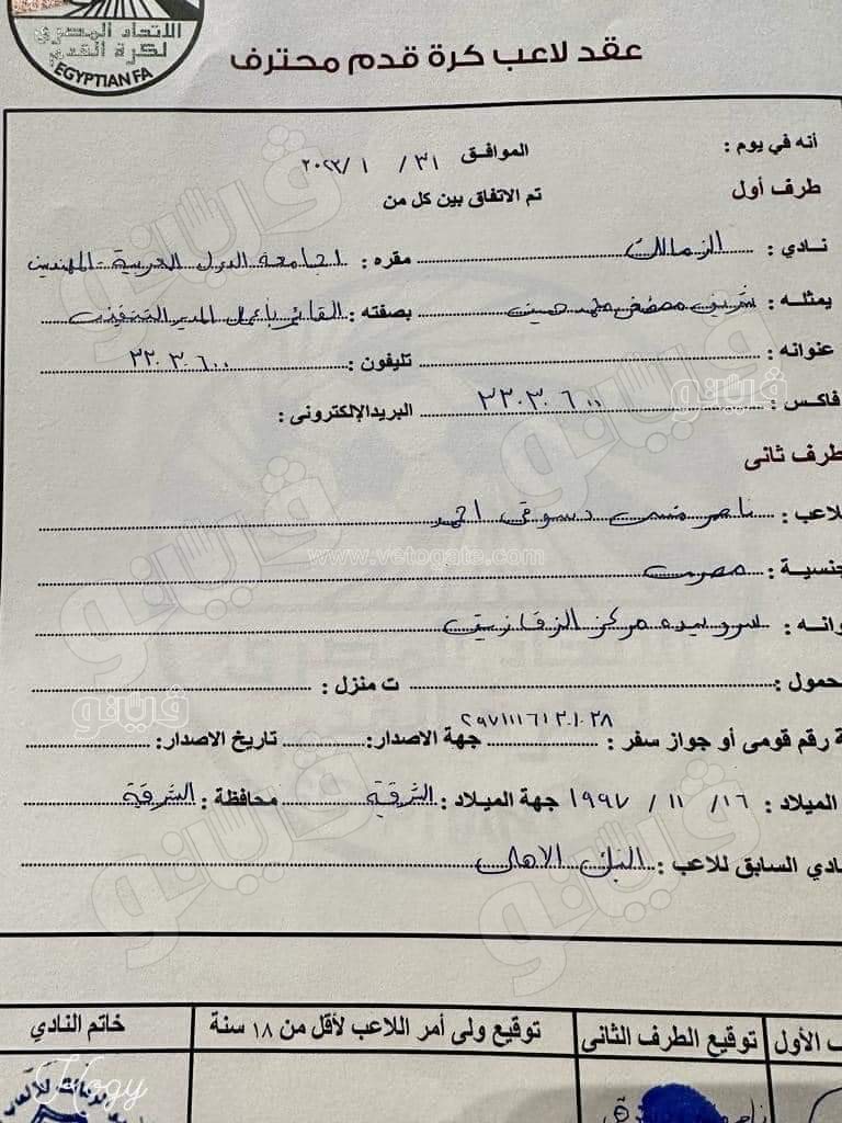 الزمالك، حصلت فيتو على نسخة من عقد ناصر منسي المنضم حديثا إلى نادي الزمالك في الانتقالات الشتوية الماضية.