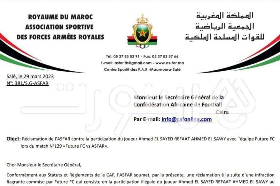 وطالب الجيش الملكي وبيراميدز بنقاط المباراة خاصة أن أحمد رفعت لاعب فيوتشر تمت إعارته، في بداية الموسم الكروي الحالي إلى نادي الوحدة الإماراتي، قبل أن يعود لفيوتشر في “الميركاتو الشتوي، دون أن يتم قيده في لوائح “الكاف” مرة ثانية كما تنص على ذلك لوائح المسابقة بحسب موقع هسبورت المغربي.