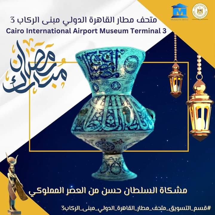 عرض متحف مطار القاهرة الدولي نموذجا لمشكاة السلطان حسن من العصر المملوكي من القرن الثامن الهجري الرابع عشر الميلادي، وهي من الزجاج المموه بالمينا.
