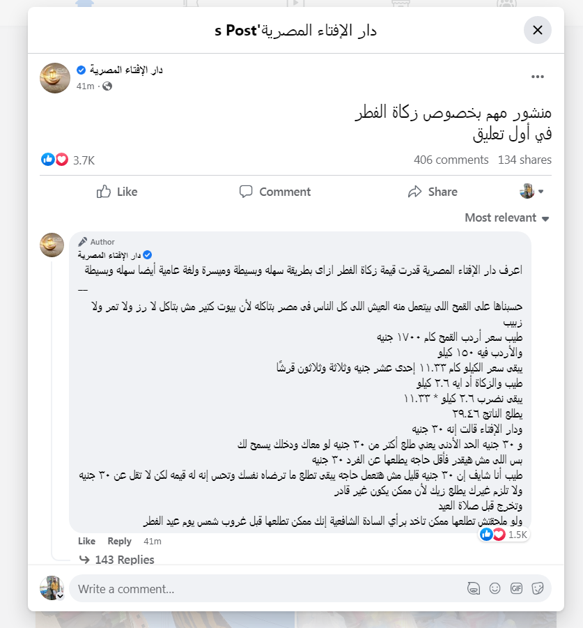 وأوضح الدكتور شوقي علَّام مفتي الجمهورية، أنَّ تقدير قيمة زكاة الفطر لهذا العام لتكون عند مستوى 30 جنيهًا، جاء كحدٍّ أدنى عن كل فرد، مع استحباب الزيادة عن هذا المبلغ لمن أراد والله يضاعف لمن يشاء، مشيرًا إلى أن دار الإفتاء المصرية أخذت برأي الإمام أبي حنيفة في جواز إخراج زكاة الفطر بالقيمة نقودًا بدلًا من الحبوب؛ تيسيرًا على الفقراء في قضاء حاجاتهم ومطالبهم، والفتوى مستقرة على ذلك.