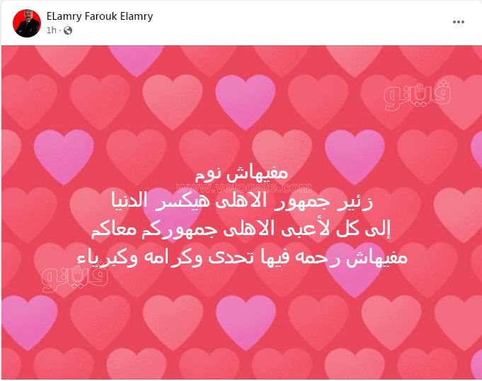 وكتب العامري فاروق رسالة للاعبي الأهلي عبر حسابه الشخصي على موقع التواصل الإجتماعي فيسبوك: “ما فيهاش نوم.. زئير جمهور الأهلي هيكسر الدنيا.. إلى كل لاعبي الأهلي جمهوركم معاكم.. ما فيهاش رحمة فيها تحدي وكرامة وكبرياء”.