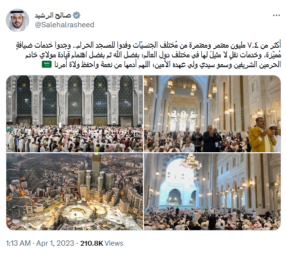 وأضاف الرشيد، في تغريدة عبر "تويتر"، أن "المعتمرين وجدوا خدمات ضيافة مميزة، وخدمات نقل لا مثيل لها في مختلف دول العالم".