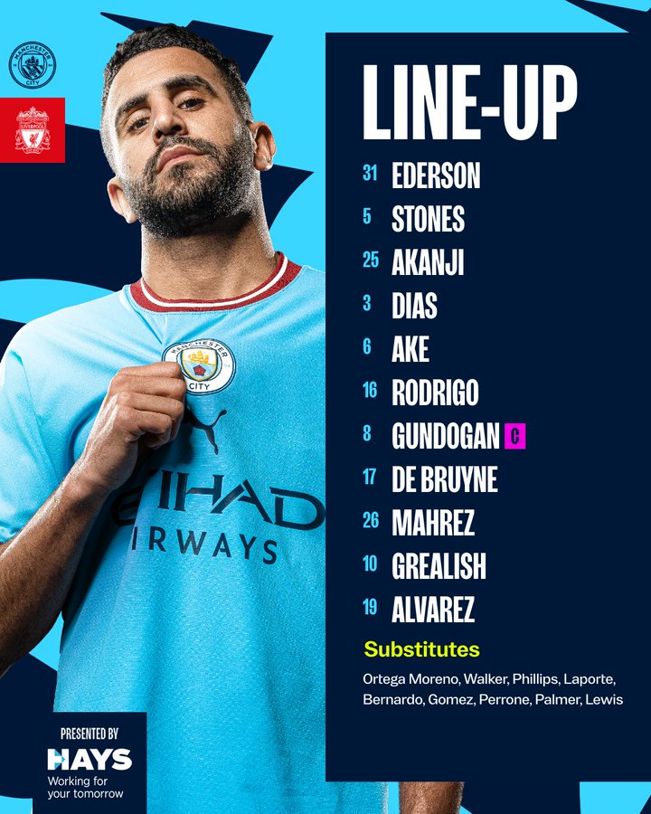الدوري الإنجليزي، أعلن بيب جوارديولا المدير الفني لفريق مانشستر سيتي عن تشكيل فريقه لمواجهة ليفربول على ملعب الاتحاد، ضمن منافسات الجولة 29 من الدوري الإنجليزي الممتاز.