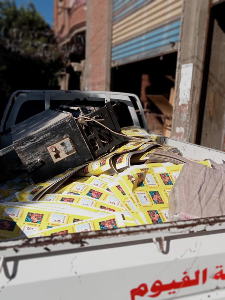 وقال الدكتور محمد التوني معاون محافظ الفيوم، المتحدث الرسمي للمحافظة، المشرف على وحدة المتابعة الميدانية، إن حملة من المتابعة الميدانية، برئاسة سالم فتيح، بالتعاون مع شرطة المسطحات، وإدارة البيئة بالمحافظة، قد تمكنت من ضبط ورشة لتصنيع العبوات الكرتونية للصواريخ والشماريخ بعزبة صفر، التابعة للوحدة المحلية بقرية زاوية الكرادسة، وتم مصادرة كميات كبيرة من الكرتون المجهز للصواريخ، كما تم مصادرة الةالطباعة علي الكرتون، وإخطار مديرية التموين التي حررت المحضر اللازم.