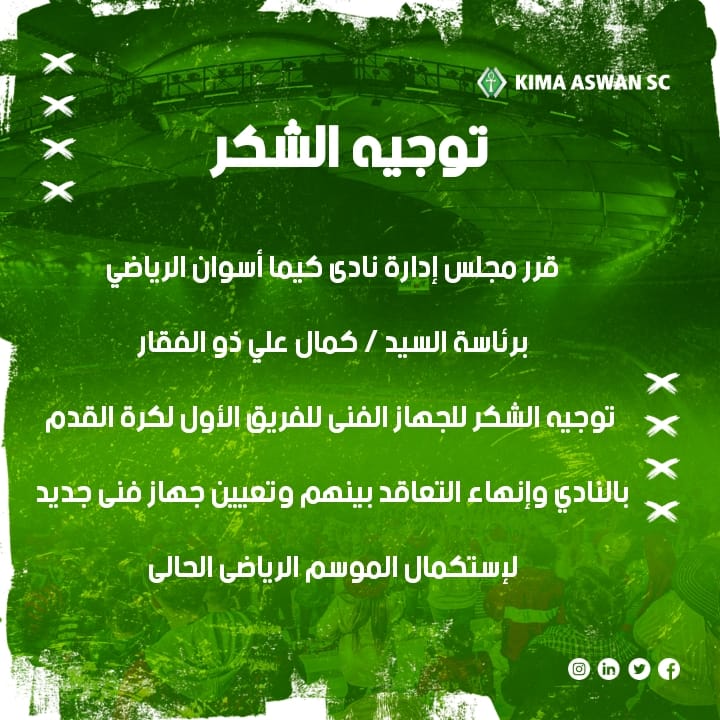 كيما أسوان ، استقر مجلس إدارة نادي كيما أسوان برئاسة كمال ذو الفقار على توجية الشكر إلى علي عاشور المدير الفني للفريق الأول لكرة القدم خلال فترة التوقف الحالية بعد مرور 23 جولة من مسابقه دوري القسم الثاني