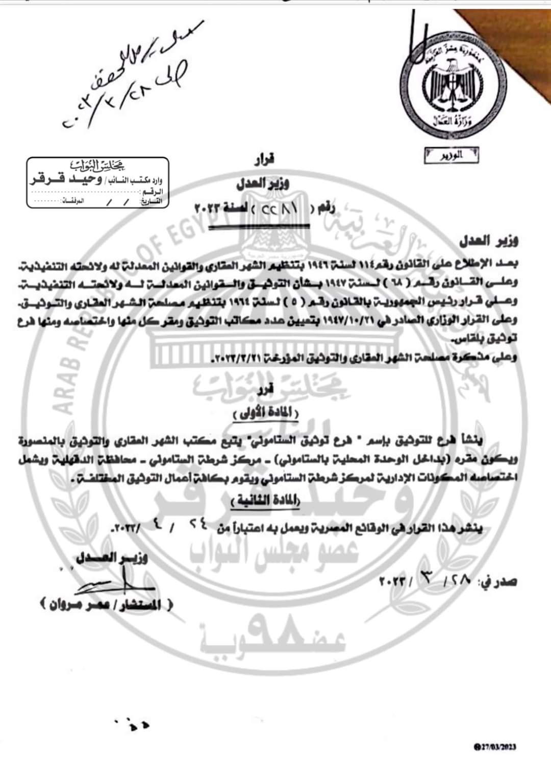 حيث قرر المستشار عمر مروان وزير العدل بفتح مكتب توثيق شهر عقارى الستامونى ومكتب توثيق شهر عقارى جمصة ابتداءا من يوم ٢٤ /٤ /٢٠٢٣