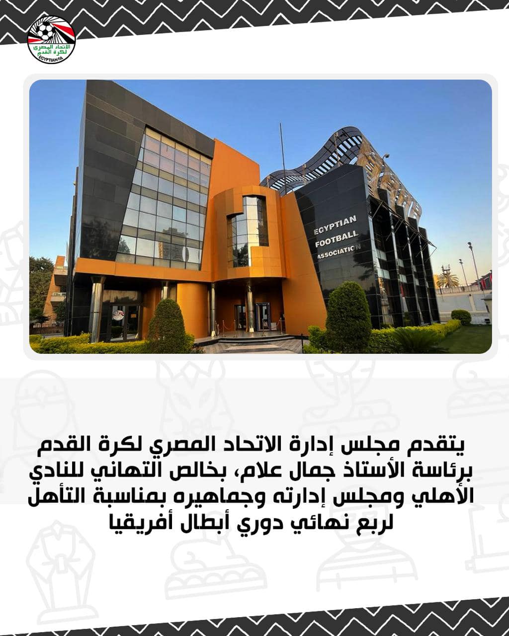 دوري أبطال أفريقيا، تقدم مجلس إدارة الاتحاد المصري لكرة القدم برئاسة جمال علام، بخالص التهاني للنادي الأهلي ومجلس إدارته وجماهيره بمناسبة التأهل لربع نهائي دوري أبطال أفريقيا.