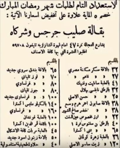 وأعلنت بقالة صليب جرجس عن قائمة اسعار المواد الغذائية والمكسرات بخصومات كبيرة فيصل سعر اقة السكر فيها الى 18 مليما و70 مليما لكيلو اللوز وحلوانى الشرق الذى يعرض منتجات الياميش والحلويات الشرقية إلى جانب أسعار العمرة فى رمضان والتى تبدأ أسعارها من 182 جنيها عام 1953 وهناك العمرة عن طريق البحر بسعر 136 جنيه فقط.