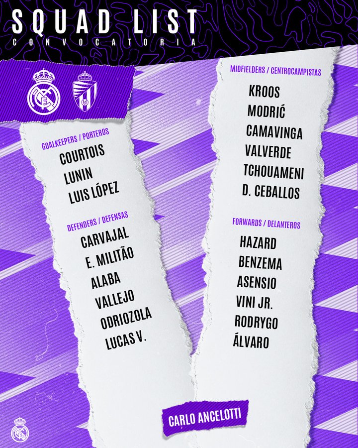 واعلن الإيطالي كارلو أنشيلوتي المدير الفني لفريق ريال مدريد عن قائمة فريقه لمواجهة بلد الوليد وضمت كلا من: